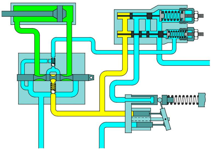 當(dāng)液壓系統(tǒng)未工作,處于待機(jī)狀態(tài)時(shí),控制閥必須切斷作動(dòng)油缸(或馬達(dá))與液壓泵之間的壓力信號(hào)。這將在系統(tǒng)未工作時(shí)導(dǎo)致液壓泵自動(dòng)轉(zhuǎn)入低壓等待狀態(tài)。當(dāng)控制閥工作時(shí),先從作動(dòng)油缸(或馬達(dá))得到壓力需求,并將壓力信號(hào)傳遞給液壓泵,使泵開始對(duì)系統(tǒng)壓力做出響應(yīng)。系統(tǒng)所需的流量是由滑閥的開度控制的。系統(tǒng)的流量需求通過(guò)信號(hào)道、控制閥反饋給液壓泵。這種負(fù)載感應(yīng)式柱塞泵與負(fù)載敏感控制閥的組合使整個(gè)液壓系統(tǒng)具有根據(jù)載荷情況提供作需壓力-流量的特性,此即負(fù)載敏感系統(tǒng)的基本功能。