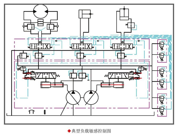 1、正如名稱所暗示的那樣,負(fù)載敏感控制技術(shù)具有監(jiān)控系統(tǒng)壓力、流量和載荷的能力;并且進(jìn)行流量-壓力參數(shù)的調(diào)節(jié)以求獲得最高的效率。但是,在討論其應(yīng)用過(guò)程及具體優(yōu)點(diǎn)之前,清楚組成負(fù)載敏感回路的液壓元件以及它們是如何協(xié)同工作至關(guān)重要;
